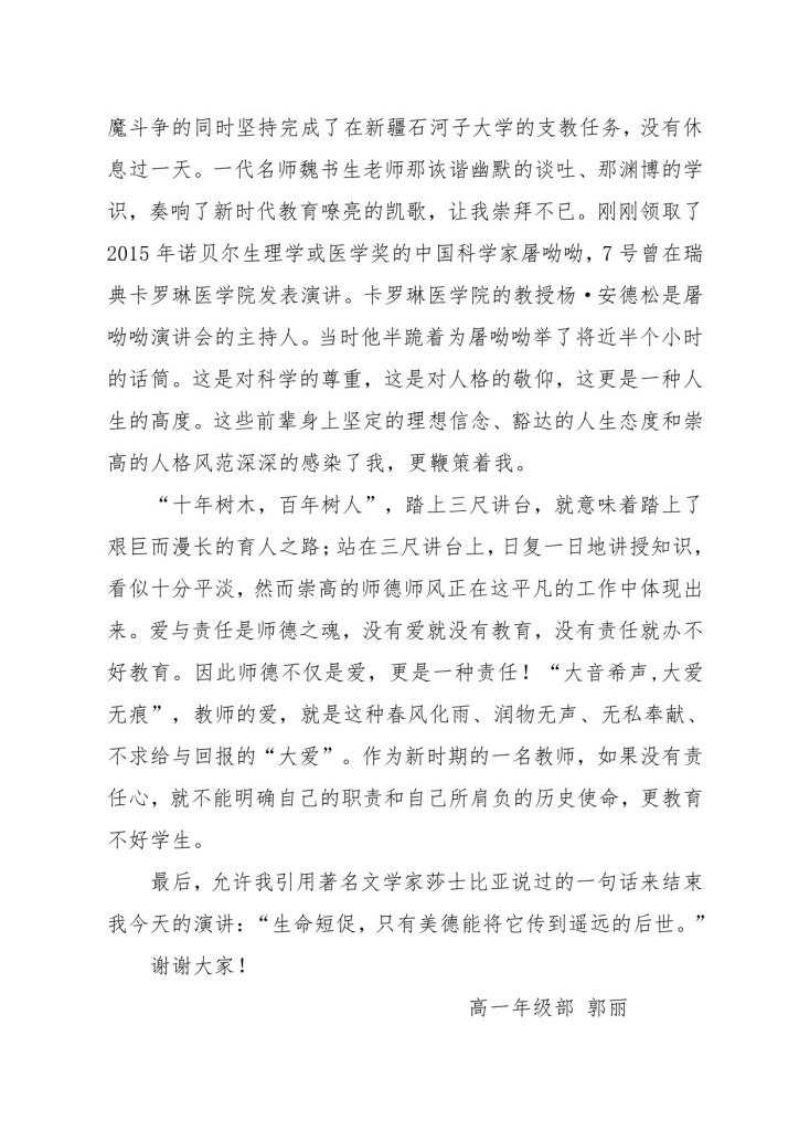 比賽中,選手們結合自身的實際工作和教育教學中的師德感悟,從不同角度謳歌了廣大教師忠誠教育事業、甘為人梯、樂于奉獻的高尚師德,以學生為本、以言傳道、以行垂范的良好師道和創新發展、求真務實、精湛高超的師藝。用師愛書寫忠誠的心路,以涓涓細流體會奉獻的甜美,體味桃李芬芳、碩果滿園的幸福與感動……一位位身邊人、一件件身邊事、一段段身邊情,娓娓道來。9位選手的演講主旨深刻、內容充實、事跡感人,充分展示了新時期教師愛崗敬業、無私奉獻的師德風范。強師德、正師風、鑄師魂,新時代的正能量在這里匯集。