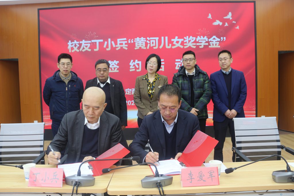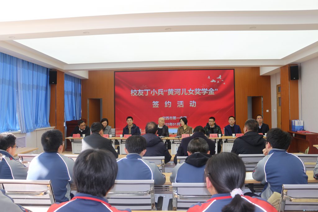 校友丁小兵先生發言。他深情回顧了當年在定西一中求學的經歷,表達了對母校的感恩之情和設立“黃河兒女獎學金”的初衷,希望在自己有能力的同時,能夠把這份愛心傳遞下去。他還鼓勵一中學子好好學習,用知識武裝自己,傳承“善”文化,寄語一中學子要心懷良知、志存高遠、腳踏實地、知行合一,做一個快樂且有價值的人。