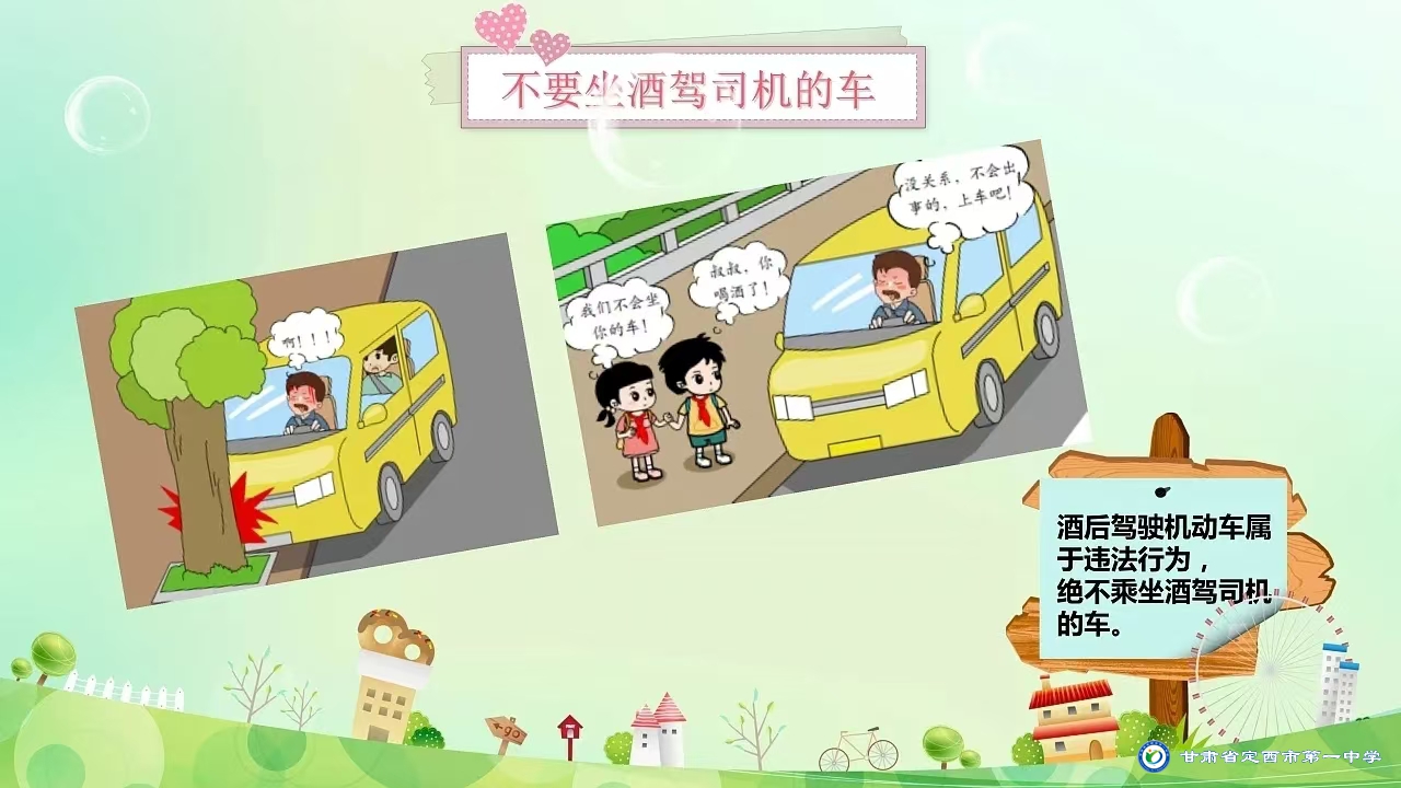 1.嚴(yán)格遵守交通法規(guī),步行時(shí)走人行道,過馬路走斑馬線,遵守信號(hào)燈指示,不翻越護(hù)欄。