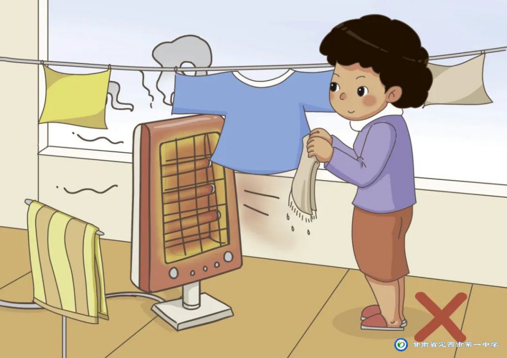 3.取暖安全,氣溫驟降,不要用電暖氣烘烤衣物或把衣物直接掛在上方,以防長時(shí)間烘烤衣物引起火災(zāi);