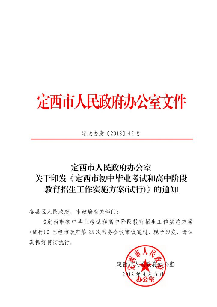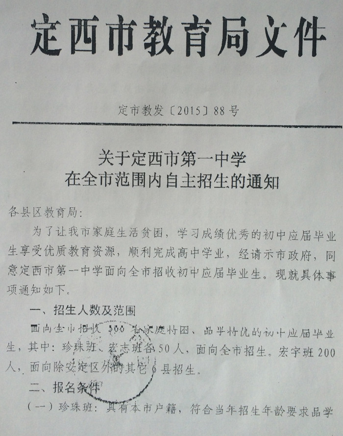 按照《定西市初中畢業考試和高中階段學校考試招生工作實施方案(試行)》精神,安定區考生(含體育特長生)報考定西市第一中學須填報第一批志愿,其他六縣考生報考定西市第一中學須關注甘肅省定西市第一中學微信公眾號,由個人單獨報名,參加提前批錄取。
