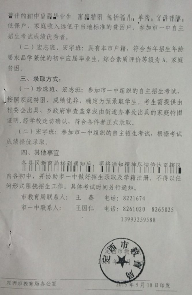 1.安定區外其他六縣考生按中考成績從高分到低分錄取(最低錄取控制分數線不得低于我校在安定區的最低錄取控制線)。已錄取的考生按成績從高分到低分按宏志班和宏毅班、珍珠班和明珠班、宏宇班和宏遠班順序平行編班。 ?