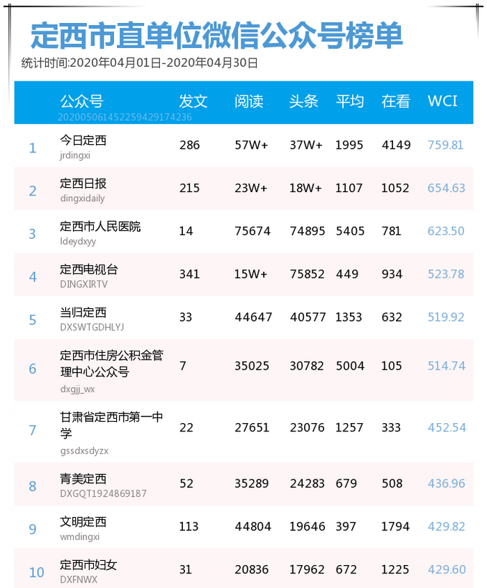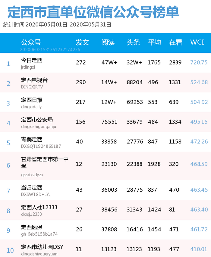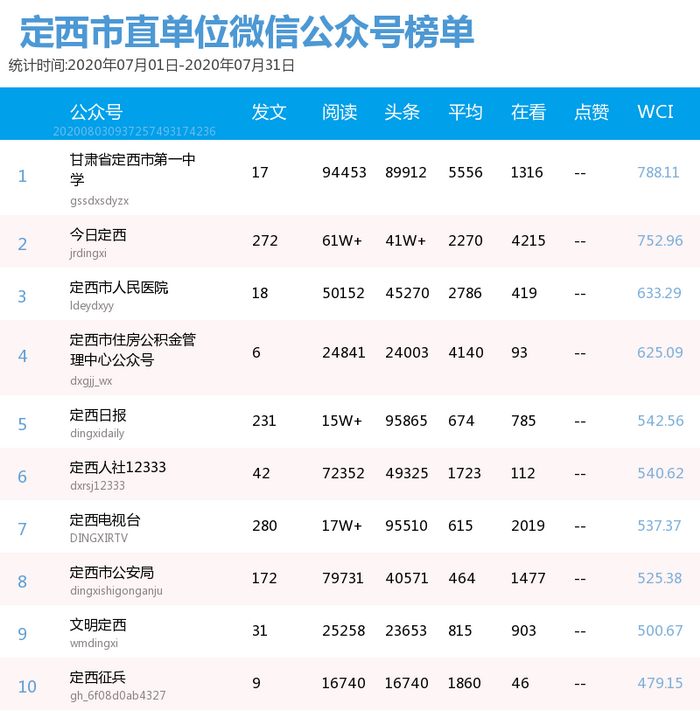 微信公眾號(hào)正日趨成為發(fā)布政府、企事業(yè)單位信息的新媒體、提供公共服務(wù)的新平臺(tái)和實(shí)現(xiàn)政民互動(dòng)的新渠道,其影響力、輻射力、以及在政府、企事業(yè)單位現(xiàn)代治理中扮演的角色和發(fā)揮的作用越來越大。由此中共定西市委網(wǎng)絡(luò)安全和信息化領(lǐng)導(dǎo)小組辦公室,進(jìn)行后臺(tái)統(tǒng)計(jì)、運(yùn)算、分析,計(jì)算出WCI(微信影響力指數(shù)),并以此推出《全市市直單位微信公眾號(hào)傳播指數(shù)月榜單》,我校微信公眾號(hào)傳播指數(shù)排名連連攀升,在7月份終于榮登榜首。