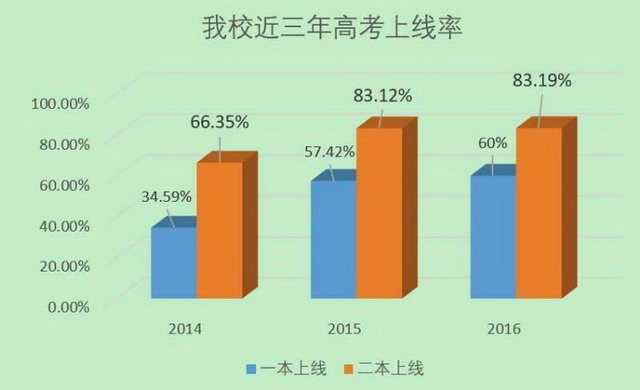 2016年高考再傳捷報,文化課考生一本上線576人,二本上線1114人,二本上線率83.19%。600分以上的考生52人,占全市198人的26.3%,其中李嘉軒同學以676分的佳績位居全省理科并列第12名,全市第2名,全區第1名。宏志班全班64人,一本上線64人,上線率100%,其中600分以上30人,總分平均成績598.4分。兩個實驗班共116人,一本上線99人,上線率86.08%,二本上線116人,上線率100%。宏宇班一本上線44人,上線率77.19%,二本上線54人,上線率100%。
