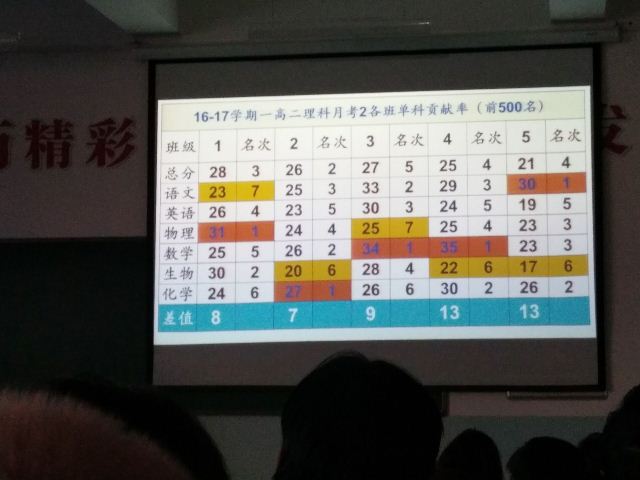 會議開始,教務處王國仁主任作分析報告,對此次月考考試進行了總結,主要包括四大模塊:第一,從試題命制、考試監考、集體閱卷和試卷評價等方面梳理了本次考試,指出其亮點和不足;第二,分析期中考試成績,通過多媒體投影各層次班級各學科的成績都清晰地呈現給在場老師,讓人一目了然;第三,對后期工作,特別是邊緣生輔導工作做出具體部署。