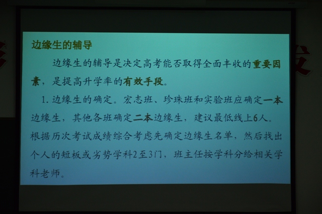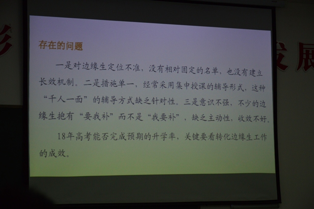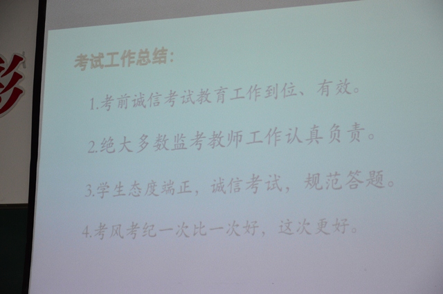會(huì)議開始,教務(wù)處王國仁主任作分析報(bào)告,對(duì)期中考試進(jìn)行了總結(jié),主要包括四大模塊:第一,從試題命制、考試監(jiān)考、集體閱卷和試卷評(píng)價(jià)等方面梳理了本次期中考試,指出其亮點(diǎn)和不足;第二,分析期中考試成績(jī),通過多媒體投影各層次班級(jí)各學(xué)科的成績(jī)都清晰地呈現(xiàn)給在場(chǎng)老師,讓人一目了然;第三,總結(jié)前期教學(xué)工作,回顧了半個(gè)學(xué)期以來教學(xué)方面的得與失;第四,對(duì)后期工作,特別是邊緣生輔導(dǎo)工作做出具體部署。