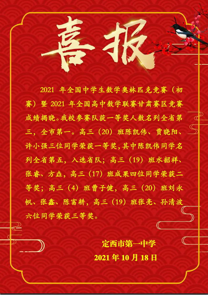 喜 報 時間:2021-10-18 分類:校園新聞 分享: 上一個: 喜 報 下一個: 喜 報 相關文章 賡續紅色血脈,勇擔育人使命——校黨委組織黨員教師開展學習貫徹黨的二十屆四中全會精神主題黨日活動 聚智兼善育品格 學思踐悟促成長—— 我校教師代表赴兼善中學參加交流活動 定西一中“對話名校 筑夢未來”系列活動|哈爾濱工業大學專場 【區域聯動 眾行致遠】智慧共享 ?智研共贏 定西一中“對話名校 筑夢未來”系列活動|山東大學專場 【“三抓三促”行動進行時】幫扶搭臺連校際 互鑒同行共育人 解碼科技革命浪潮 啟迪創新育人之路—— 福耀科技大學校長王樹國走進定西一中開講 中國科學院大學蒞臨定西市第一中學開展招生宣講工作