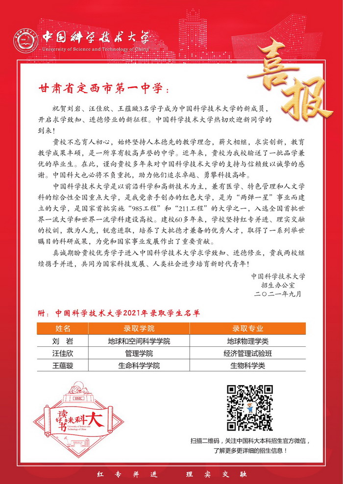 喜 報 時間:2021-09-20 分類:校園新聞 分享: 上一個: 懷揣夢想不負青春,逐夢定中揚帆啟航 下一個: 凝聚共識尋突破,協力備考開新局 相關文章 賡續紅色血脈,勇擔育人使命——校黨委組織黨員教師開展學習貫徹黨的二十屆四中全會精神主題黨日活動 聚智兼善育品格 學思踐悟促成長—— 我校教師代表赴兼善中學參加交流活動 定西一中“對話名校 筑夢未來”系列活動|哈爾濱工業大學專場 【區域聯動 眾行致遠】智慧共享 ?智研共贏 定西一中“對話名校 筑夢未來”系列活動|山東大學專場 【“三抓三促”行動進行時】幫扶搭臺連校際 互鑒同行共育人 解碼科技革命浪潮 啟迪創新育人之路—— 福耀科技大學校長王樹國走進定西一中開講 中國科學院大學蒞臨定西市第一中學開展招生宣講工作