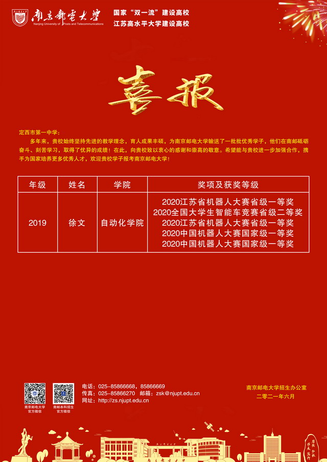 來自南京郵電大學的喜報 時間:2021-06-09 分類:校園新聞 分享: 上一個: 又是一年槐花香 蟾宮折桂實可待 下一個: 凝心聚力開新局 集體前行譜新篇 相關文章 賡續紅色血脈,勇擔育人使命——校黨委組織黨員教師開展學習貫徹黨的二十屆四中全會精神主題黨日活動 聚智兼善育品格 學思踐悟促成長—— 我校教師代表赴兼善中學參加交流活動 定西一中“對話名校 筑夢未來”系列活動|哈爾濱工業大學專場 【區域聯動 眾行致遠】智慧共享 ?智研共贏 定西一中“對話名校 筑夢未來”系列活動|山東大學專場 【“三抓三促”行動進行時】幫扶搭臺連校際 互鑒同行共育人 解碼科技革命浪潮 啟迪創新育人之路—— 福耀科技大學校長王樹國走進定西一中開講 中國科學院大學蒞臨定西市第一中學開展招生宣講工作