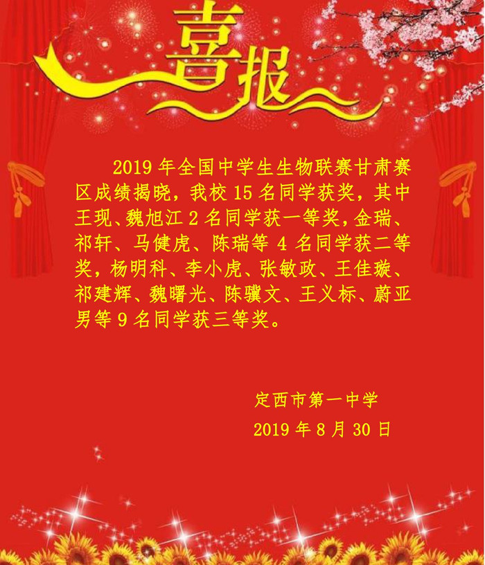 喜 報 時間:2019-08-30 分類:校園新聞 分享: 上一個: 詩詞大舞臺 厚積展風采 下一個: 良好的開端是成功的一半 相關文章 賡續紅色血脈,勇擔育人使命——校黨委組織黨員教師開展學習貫徹黨的二十屆四中全會精神主題黨日活動 聚智兼善育品格 學思踐悟促成長—— 我校教師代表赴兼善中學參加交流活動 定西一中“對話名校 筑夢未來”系列活動|哈爾濱工業大學專場 【區域聯動 眾行致遠】智慧共享 ?智研共贏 定西一中“對話名校 筑夢未來”系列活動|山東大學專場 【“三抓三促”行動進行時】幫扶搭臺連校際 互鑒同行共育人 解碼科技革命浪潮 啟迪創新育人之路—— 福耀科技大學校長王樹國走進定西一中開講 中國科學院大學蒞臨定西市第一中學開展招生宣講工作