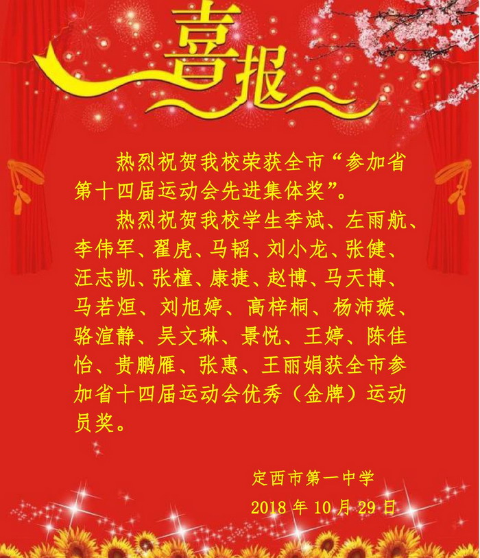 喜 報 時間:2018-10-29 分類:校園新聞 分享: 上一個: 喜 報 下一個: 我校召開家長會暨家長代表、家長委員會會議 相關文章 賡續紅色血脈,勇擔育人使命——校黨委組織黨員教師開展學習貫徹黨的二十屆四中全會精神主題黨日活動 聚智兼善育品格 學思踐悟促成長—— 我校教師代表赴兼善中學參加交流活動 定西一中“對話名校 筑夢未來”系列活動|哈爾濱工業大學專場 【區域聯動 眾行致遠】智慧共享 ?智研共贏 定西一中“對話名校 筑夢未來”系列活動|山東大學專場 【“三抓三促”行動進行時】幫扶搭臺連校際 互鑒同行共育人 解碼科技革命浪潮 啟迪創新育人之路—— 福耀科技大學校長王樹國走進定西一中開講 中國科學院大學蒞臨定西市第一中學開展招生宣講工作