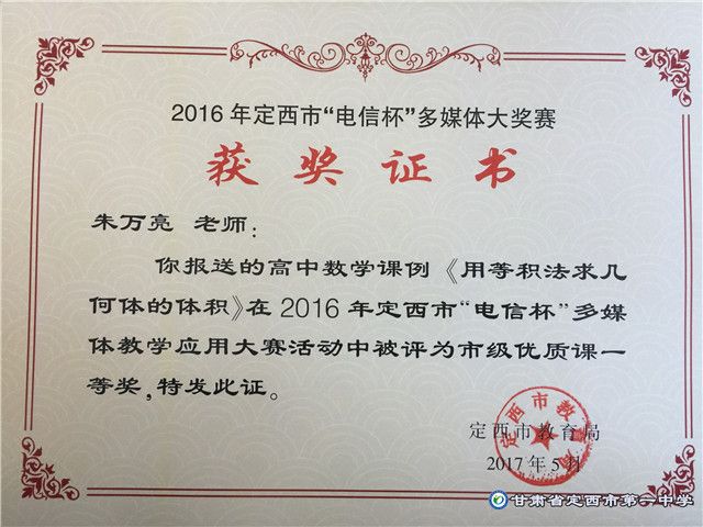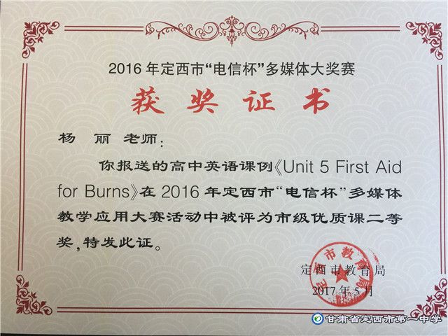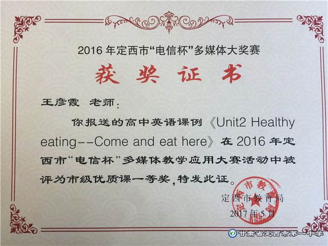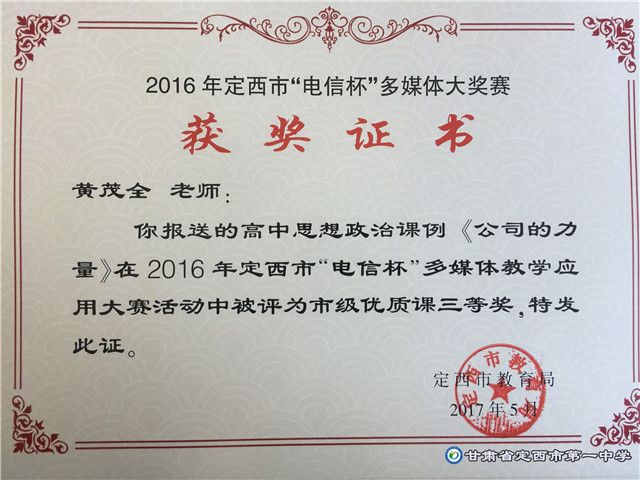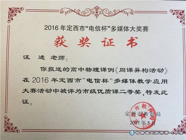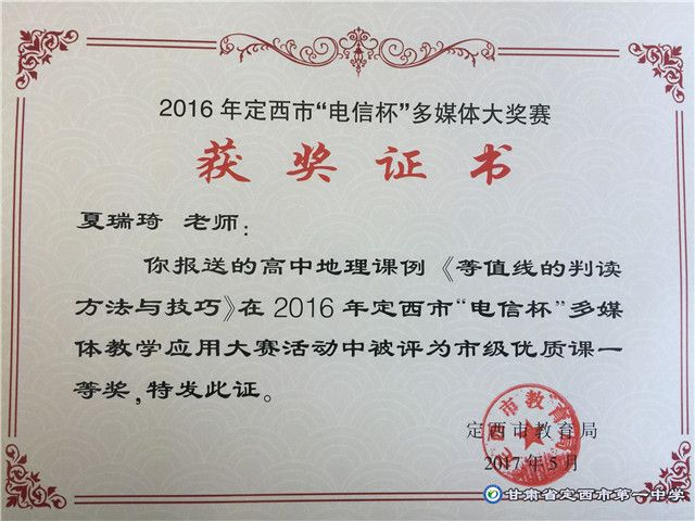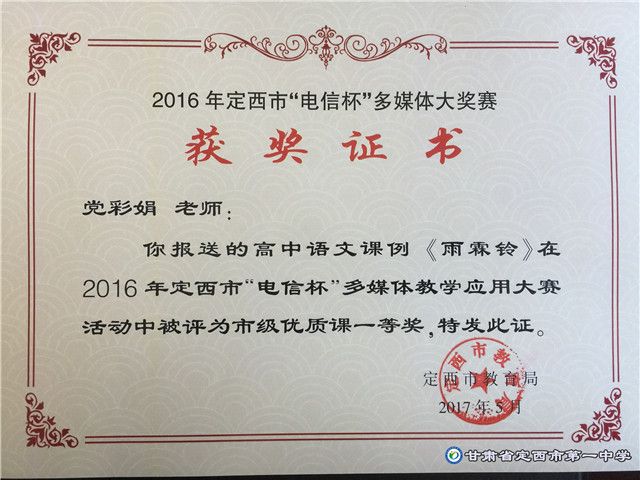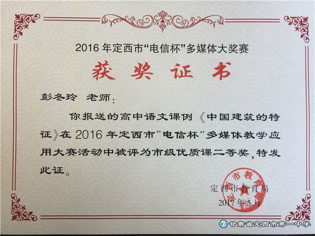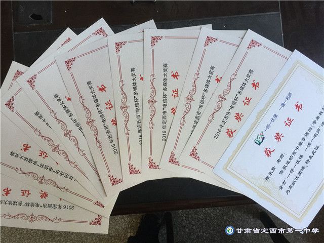 在定西市2016年“電信杯”多媒體教學(xué)應(yīng)用大賽中,我校黨彩娟、朱萬亮、王彥霞、夏瑞琦老師的課例獲高中學(xué)段一等獎(jiǎng);彭冬玲、楊麗、汪進(jìn)、廖樂星老師的課例獲高中學(xué)段二等獎(jiǎng);黃茂全老師的課例獲高中學(xué)段三等獎(jiǎng)。