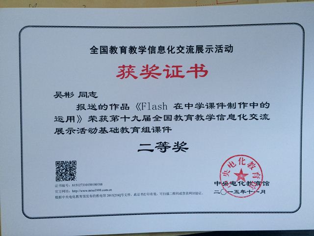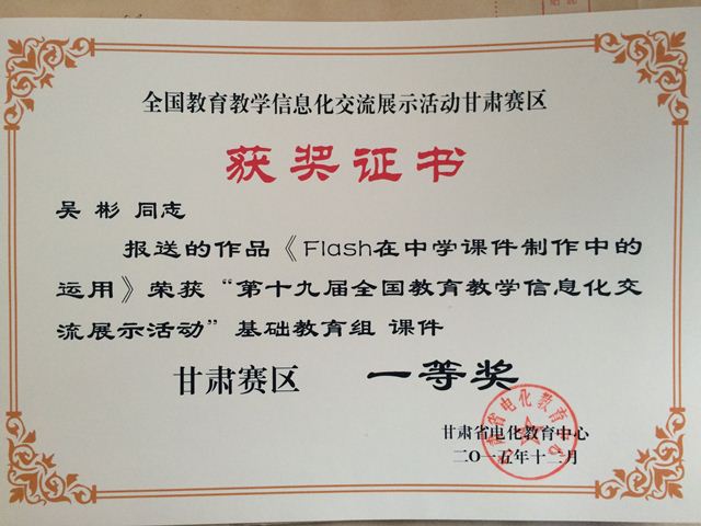簡訊 時間:2016-01-08 分類:校園新聞 在“第十九屆全國教育教學信息化交流展示活動”中,我校教師吳彬報送的課件《Flash在中學課件制作中的運用》獲基礎教育組課件,全國二等獎,甘肅省賽區一等獎。 分享: 上一個: 集思廣益 共謀發展 下一個: 我校領導節前慰問離退休教師 相關文章 賡續紅色血脈,勇擔育人使命——校黨委組織黨員教師開展學習貫徹黨的二十屆四中全會精神主題黨日活動 聚智兼善育品格 學思踐悟促成長—— 我校教師代表赴兼善中學參加交流活動 定西一中“對話名校 筑夢未來”系列活動|哈爾濱工業大學專場 【區域聯動 眾行致遠】智慧共享 ?智研共贏 定西一中“對話名校 筑夢未來”系列活動|山東大學專場 【“三抓三促”行動進行時】幫扶搭臺連校際 互鑒同行共育人 解碼科技革命浪潮 啟迪創新育人之路—— 福耀科技大學校長王樹國走進定西一中開講 中國科學院大學蒞臨定西市第一中學開展招生宣講工作