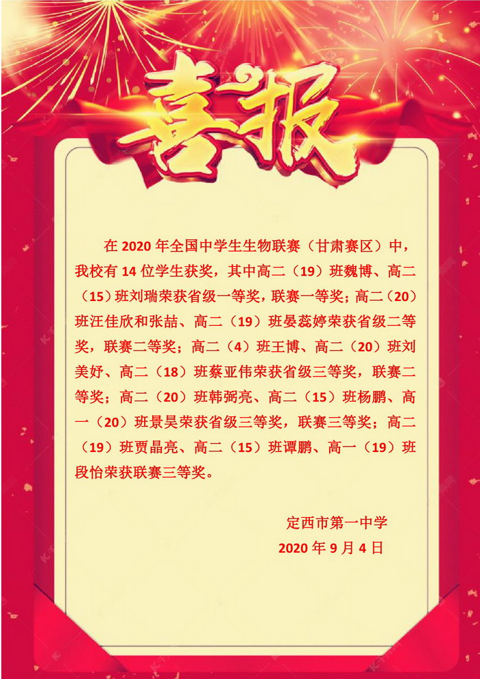 喜 報 時間:2020-09-04 分類:教研成果 分享: 上一個: 疫情防控學生征文競賽獲獎名單 下一個: 喜 報 相關文章 喜報——我校學子在2025年第42屆全國中學生物理競賽甘肅聯賽中榮獲佳績 【“三抓三促”行動進行時】喜報——我校學子在2025年全國中學生數學奧林匹克競賽甘肅賽區聯賽中榮獲佳績 【“三抓三促”行動進行時】喜報——我校教師在2025年全市中小學基礎教育精品課遴選活動中榮獲佳績 【“三抓三促”行動進行時】喜報——我校學子在2024—2025學年全國版圖知識競賽(中小學組)活動中榮獲佳績 【“三抓三促”行動進行時】喜報——我校學子在2025年全國中學生生物學競賽甘肅賽區聯賽中榮獲佳績 【“三抓三促”行動進行時】喜報-我校學子在第21屆“外研社杯”全國中學生外語素養大賽中榮獲佳績 【“三抓三促”行動進行時】喜報——我校學子在2024年第41屆全國中學生物理競賽甘肅賽區聯賽中榮獲佳績 【“三抓三促”行動進行時】喜報——熱烈祝賀我校學子蔣啟明在第38屆中國化學奧林匹克競賽決賽中榮獲銅牌