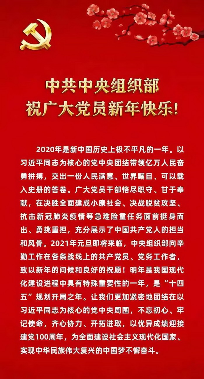 中共中央組織部祝廣大黨員新年快樂 時間:2020-12-31 分類:黨建動態 分享: 上一個: 碧血成師德 丹心筑師魂 下一個: 習近平同志《論中國共產黨歷史》主要篇目介紹 相關文章 市委第四巡察組向定西一中黨委反饋巡察情況 【“三抓三促”行動進行時】市委第四巡察組巡察定西一中黨委公告 【“三抓三促”行動進行時】市委第四巡察組巡察定西一中黨委工作動員會召開 “弘揚踐行教育家精神”系列微黨課 【“三抓三促”行動進行時】德潤桃李,言啟智慧——定西市第一中學舉辦2024年“強師德 鑄師魂”演講比賽 【“三抓三促”行動進行時】緬懷先烈啟新程,黨日活動溫誓詞——定西市第一中學黨委赴會寧開展主題黨日活動 我校召開2023-2024第二學期工作安排暨全面從嚴治黨工作大會 “行走的大思政課”——走進城市展覽館,感受新時代十年偉大變革