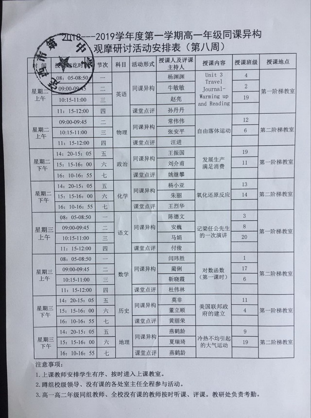 繼高二年級“同課異構”教學觀摩研討活動之后,10月16——17日,我校高一年級也組織了語文、數學、英語、物理、化學、政治、歷史、地理八個學科的“同課異構”教學觀摩研討活動。活動在尚德樓的兩個階梯教室進行。本次教學活動分上課和評課兩個環節。全校411人次參加了聽、評課活動。