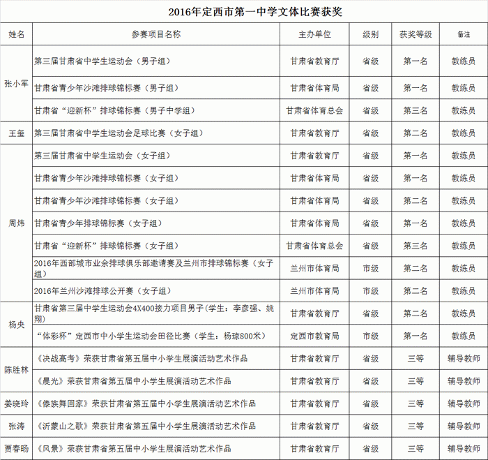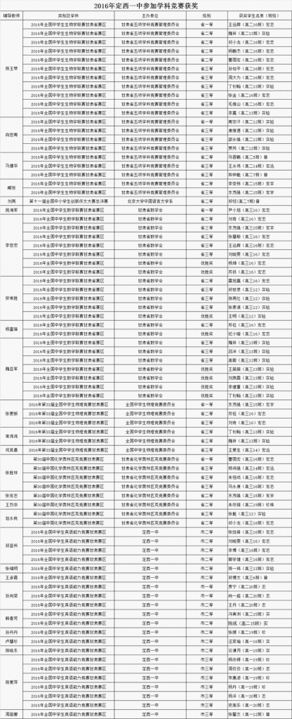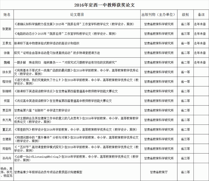定西市第一中學2016年教研成果 時間:2017-03-07 分類:教研成果 分享: 上一個: 我校多人在第十八屆“語文報杯” 全國中小學作文大賽中獲獎 下一個: 喜 報 相關文章 喜報——我校學子在2025年第42屆全國中學生物理競賽甘肅聯賽中榮獲佳績 【“三抓三促”行動進行時】喜報——我校學子在2025年全國中學生數學奧林匹克競賽甘肅賽區聯賽中榮獲佳績 【“三抓三促”行動進行時】喜報——我校教師在2025年全市中小學基礎教育精品課遴選活動中榮獲佳績 【“三抓三促”行動進行時】喜報——我校學子在2024—2025學年全國版圖知識競賽(中小學組)活動中榮獲佳績 【“三抓三促”行動進行時】喜報——我校學子在2025年全國中學生生物學競賽甘肅賽區聯賽中榮獲佳績 【“三抓三促”行動進行時】喜報-我校學子在第21屆“外研社杯”全國中學生外語素養大賽中榮獲佳績 【“三抓三促”行動進行時】喜報——我校學子在2024年第41屆全國中學生物理競賽甘肅賽區聯賽中榮獲佳績 【“三抓三促”行動進行時】喜報——熱烈祝賀我校學子蔣啟明在第38屆中國化學奧林匹克競賽決賽中榮獲銅牌