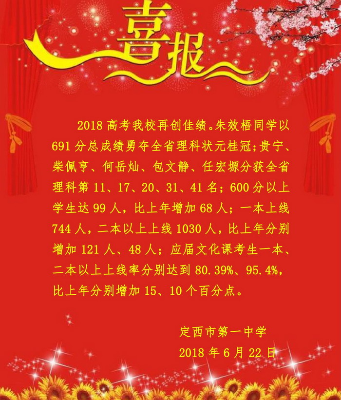 定西市第一中學2018年高考喜報(一) 時間:2018-06-22 分類:高考綜合改革 分享: 上一個: 精心組織 周密部署 下一個: 定西市第一中學2018年高考喜報(二) 相關文章 凝心聚力開新局??奮力拼搏譜華章 緊跟高考改革步伐 促進教師專業發展 云端相聚 受益匪淺 高考喜報 高考喜報 強化工作職責 熟悉工作流程 2017年—2019年高考捷報頻傳 定西市第一中學2018年高考喜報(四)