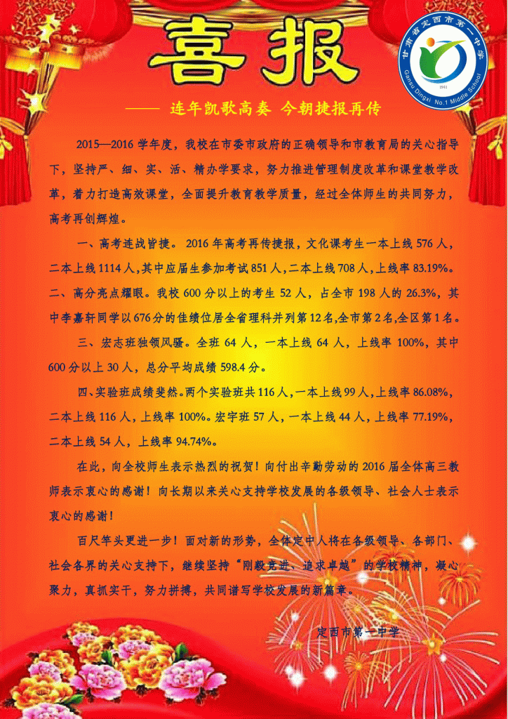 定西市第一中學2016年高考喜報(二) 時間:2016-06-24 分類:高考綜合改革 分享: 上一個: 2016年甘肅高考分數線公布 下一個: 定西市第一中學2016年高考喜報(三) 相關文章 凝心聚力開新局??奮力拼搏譜華章 緊跟高考改革步伐 促進教師專業發展 云端相聚 受益匪淺 高考喜報 高考喜報 強化工作職責 熟悉工作流程 2017年—2019年高考捷報頻傳 定西市第一中學2018年高考喜報(四)