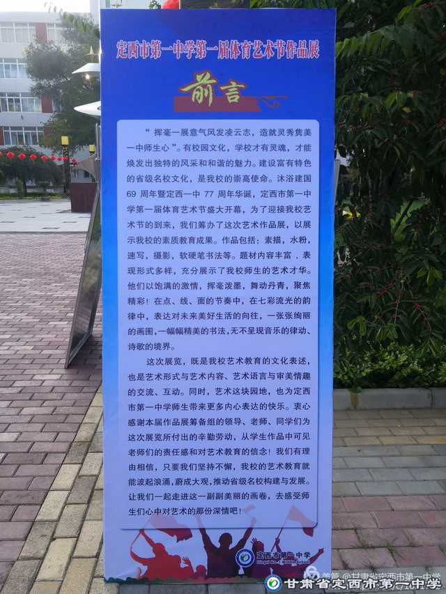 【第一屆體育藝術節】定西市第一中學第一屆體育藝術節作品展 時間:2018-09-29 分類:體藝風采 分享: 上一個: 【第一屆體育藝術節】市委常委、副市長高生發視察我校第一屆體育藝術節工作 下一個: 【第一屆體育藝術節】定西市第一中學第一屆體育藝術節閉幕 相關文章 青春綻放,心向未來——我校第八屆校園體育藝術節圓滿閉幕 定西市第一中學第八屆體育藝術節:運動與藝術的雙向奔赴 燃情九月,逐夢賽場——定西市第一中學第八屆體育藝術節盛大開幕 喜報!定西一中男女排雙雙奪冠 燃爆賽場!我校四支代表隊勇奪市級選拔賽雙冠王,男籃三人制摘銀! 球場爭鋒展風采,乘風破浪鑄師魂——我校舉辦教職工籃球和氣排球比賽 【“三抓三促”行動進行時】金秋迎重陽,快樂健康行——定西市第一中學開展重陽節登山比賽活動 【“三抓三促”行動進行時】以青春之花,結奮斗之果——我校文藝匯演暨第七屆校園體育藝術節圓滿閉幕