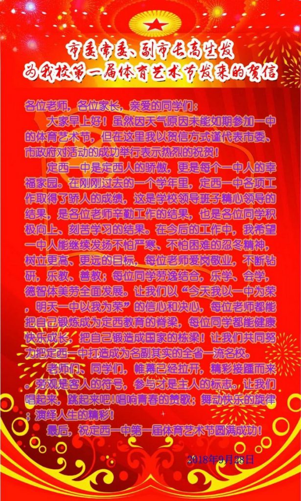 【第一屆體育藝術節】市委常委、副市長高生發為我校第一屆體育藝術節發來的賀信 時間:2018-09-28 分類:體藝風采 分享: 上一個: 【第一屆體育藝術節】定西市第一中學第一屆體育藝術節開幕 下一個: 【第一屆體育藝術節】市委常委、副市長高生發視察我校第一屆體育藝術節工作 相關文章 青春綻放,心向未來——我校第八屆校園體育藝術節圓滿閉幕 定西市第一中學第八屆體育藝術節:運動與藝術的雙向奔赴 燃情九月,逐夢賽場——定西市第一中學第八屆體育藝術節盛大開幕 喜報!定西一中男女排雙雙奪冠 燃爆賽場!我校四支代表隊勇奪市級選拔賽雙冠王,男籃三人制摘銀! 球場爭鋒展風采,乘風破浪鑄師魂——我校舉辦教職工籃球和氣排球比賽 【“三抓三促”行動進行時】金秋迎重陽,快樂健康行——定西市第一中學開展重陽節登山比賽活動 【“三抓三促”行動進行時】以青春之花,結奮斗之果——我校文藝匯演暨第七屆校園體育藝術節圓滿閉幕