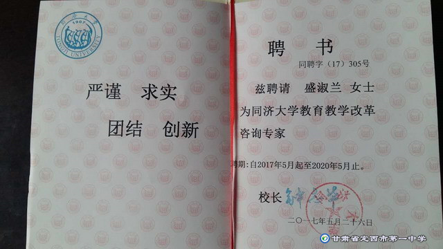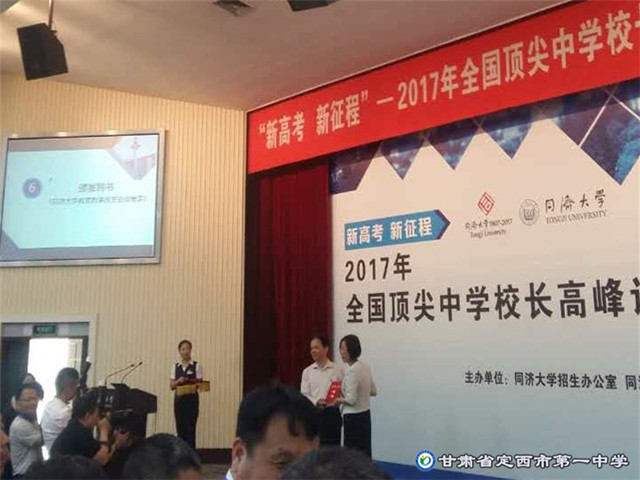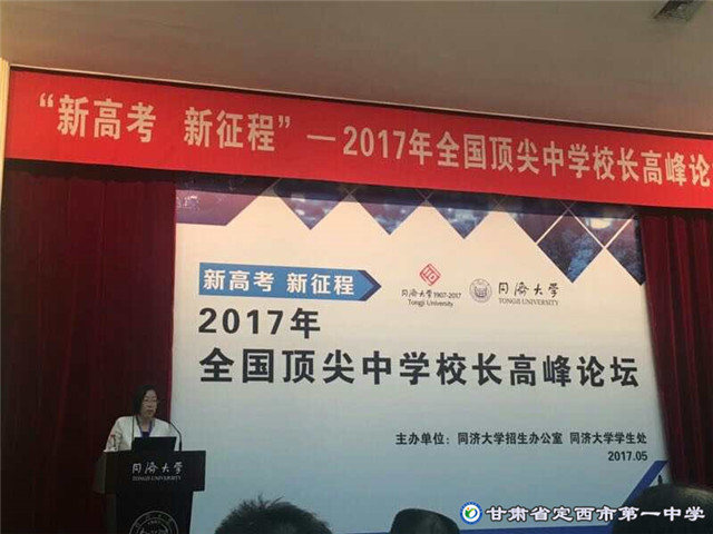 ? ??2017年5月27—5月28日,受同濟(jì)大學(xué)邀請(qǐng),我校校長(zhǎng)盛淑蘭應(yīng)邀參加“新高考 新征程—2017年全國(guó)頂尖中學(xué)校長(zhǎng)高峰論壇”。此次甘肅受邀請(qǐng)的高中還有西北師大附中、蘭州一中。此次論壇有全國(guó)29個(gè)省份的122名高中校長(zhǎng)針對(duì)新高考背景下高等教育與基礎(chǔ)教育合作、合力培養(yǎng)創(chuàng)新拔尖卓越人才方式展開了全方位討論,我校校長(zhǎng)盛淑蘭代表甘肅等10省份的27位校長(zhǎng)在大會(huì)上做了交流發(fā)言。并被同濟(jì)大學(xué)聘請(qǐng)為同濟(jì)大學(xué)教育教學(xué)改革咨詢專家。