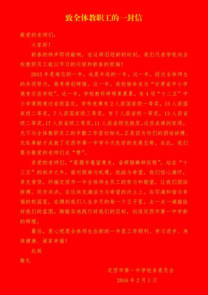 致全體教職工的一封信 時間:2016-02-02 分類:校園新聞 分享: 上一個: 我校領導節前慰問離退休教師 下一個: 百日誓師 決戰高考 相關文章 賡續紅色血脈,勇擔育人使命——校黨委組織黨員教師開展學習貫徹黨的二十屆四中全會精神主題黨日活動 聚智兼善育品格 學思踐悟促成長—— 我校教師代表赴兼善中學參加交流活動 定西一中“對話名校 筑夢未來”系列活動|哈爾濱工業大學專場 【區域聯動 眾行致遠】智慧共享 ?智研共贏 定西一中“對話名校 筑夢未來”系列活動|山東大學專場 【“三抓三促”行動進行時】幫扶搭臺連校際 互鑒同行共育人 解碼科技革命浪潮 啟迪創新育人之路—— 福耀科技大學校長王樹國走進定西一中開講 中國科學院大學蒞臨定西市第一中學開展招生宣講工作