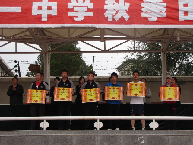 副校長劉順義宣布獲得精神文明班集體的班級,高一年級(1)班、(11)班、(14)班、(16)班、(8)班、(8)班、(9)班和(10)班,高二年級(16)班、(1)班、(7)班、(11)班、(14)班、(15)班和(6)班,高三年級(6)班、(11)班、(13)班、(14)班、(15)班、(16)班、(17)班和(18)班等共計22個班級獲得“精神文明班集體”榮譽稱號,學校領導為獲獎的班級和破紀錄的運動員同學頒發了獎狀。