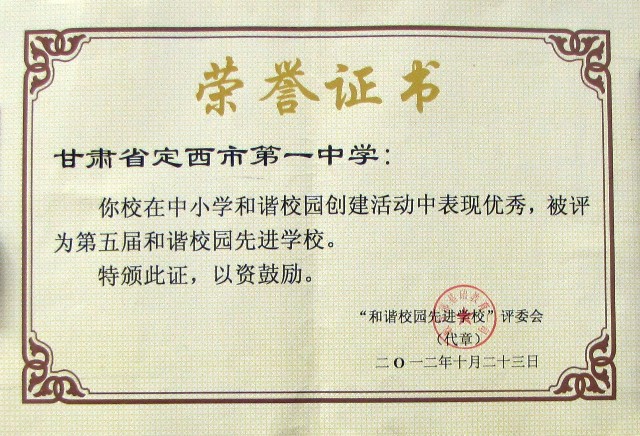 “和諧校園”先進學校 時間:2012-12-22 分類:學校榮譽 分享: 上一個: 甘肅省教育系統“先進集體” 下一個: 全國陽光體育科學健身校園行活動學校 相關文章 喜訊:定西市第一中學榮獲山東大學“2025年本科生源貢獻獎” 西北工業大學授予我校“優質生源基地”稱號 2018年工會工作目標責任考核三等獎 模范教職工小家 甘肅省文明校園 定西市教育質量振興獎 2017年度社會治安綜合治理工作“先進集體” 2017年市級“職工書屋”示范點