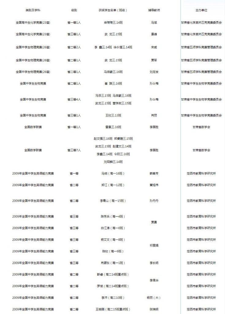 2009年定西一中參加學科競賽獲獎統計 時間:2009-12-30 分類:教研成果 分享: 下一個: 2010年定西一中參加學科競賽獲獎統計 相關文章 喜報——我校學子在2025年第42屆全國中學生物理競賽甘肅聯賽中榮獲佳績 【“三抓三促”行動進行時】喜報——我校學子在2025年全國中學生數學奧林匹克競賽甘肅賽區聯賽中榮獲佳績 【“三抓三促”行動進行時】喜報——我校教師在2025年全市中小學基礎教育精品課遴選活動中榮獲佳績 【“三抓三促”行動進行時】喜報——我校學子在2024—2025學年全國版圖知識競賽(中小學組)活動中榮獲佳績 【“三抓三促”行動進行時】喜報——我校學子在2025年全國中學生生物學競賽甘肅賽區聯賽中榮獲佳績 【“三抓三促”行動進行時】喜報-我校學子在第21屆“外研社杯”全國中學生外語素養大賽中榮獲佳績 【“三抓三促”行動進行時】喜報——我校學子在2024年第41屆全國中學生物理競賽甘肅賽區聯賽中榮獲佳績 【“三抓三促”行動進行時】喜報——熱烈祝賀我校學子蔣啟明在第38屆中國化學奧林匹克競賽決賽中榮獲銅牌