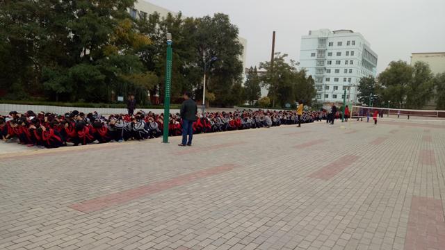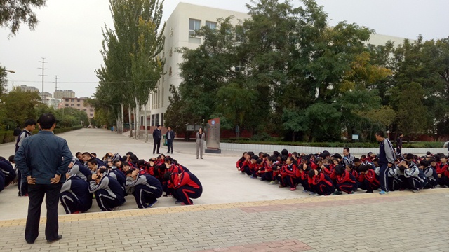 10月12日下午5點55分,一陣急促的火警警報聲拉開了我?!鞍踩枭⒀菥殹被顒拥尼∧?,聽到警報聲,各班班主任和任課老師立即到達指定崗位,指導學生快速疏散,教師帶領學生彎著腰、貓著步,捂住口鼻,沿著學校指定樓梯口快速前進,有序撤離到學校操場的安全地帶。
