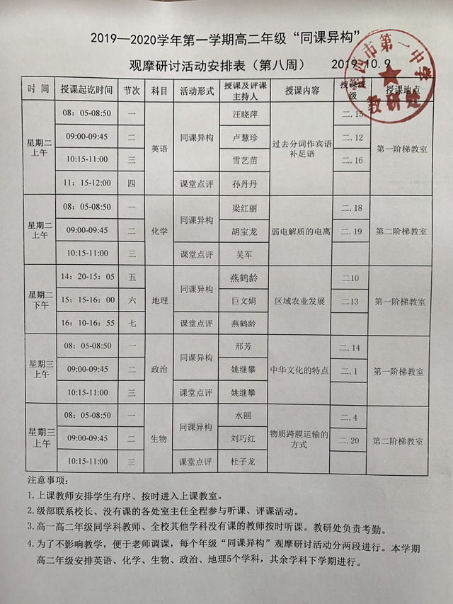 ? ? 高二年級其余五學科的“同課異構”將在下學期開展。本次活動,全校聽課評課共379人/次。