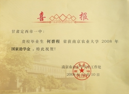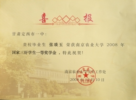 喜報 時間:2008-12-31 分類:校園新聞 2008年12月10日,南京農業大學學生工作處向我校發來喜報,我校畢業生張琰玉榮獲南京農業大學2008年國家三好學生一等獎學金,何碧程榮獲南京大學2008年國家助學金。 分享: 上一個: 獲獎信息 下一個: 蘭大黨委統戰部調研組來我校調研 相關文章 賡續紅色血脈,勇擔育人使命——校黨委組織黨員教師開展學習貫徹黨的二十屆四中全會精神主題黨日活動 聚智兼善育品格 學思踐悟促成長—— 我校教師代表赴兼善中學參加交流活動 定西一中“對話名校 筑夢未來”系列活動|哈爾濱工業大學專場 【區域聯動 眾行致遠】智慧共享 ?智研共贏 定西一中“對話名校 筑夢未來”系列活動|山東大學專場 【“三抓三促”行動進行時】幫扶搭臺連校際 互鑒同行共育人 解碼科技革命浪潮 啟迪創新育人之路—— 福耀科技大學校長王樹國走進定西一中開講 中國科學院大學蒞臨定西市第一中學開展招生宣講工作