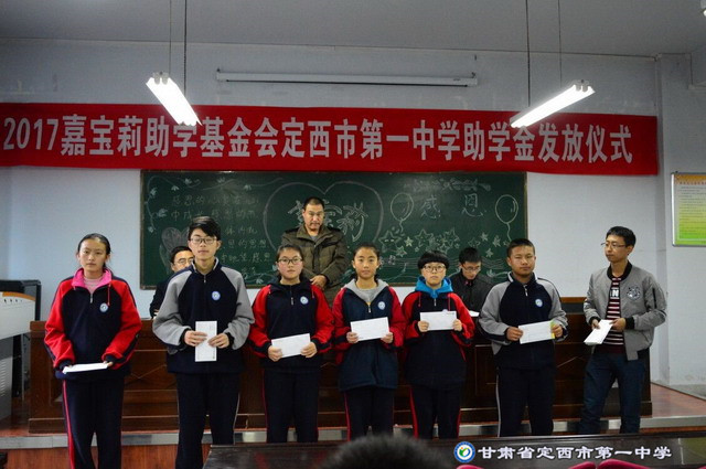 10月30日下午,2017嘉寶莉助學基金會定西一中助學金發放儀式在我校舉行。副校長劉順義、嘉寶莉集團甘肅營銷中心經理柴繼平、嘉寶莉集團定西市總代理韋保國和30名受到資助的貧困學子、學生家長代表一起出席當天的發放活動。發放儀式由政教處副主任陳曉東主持。