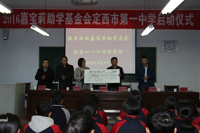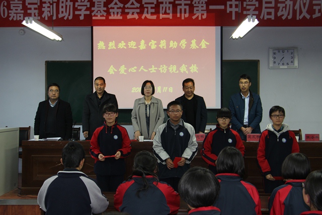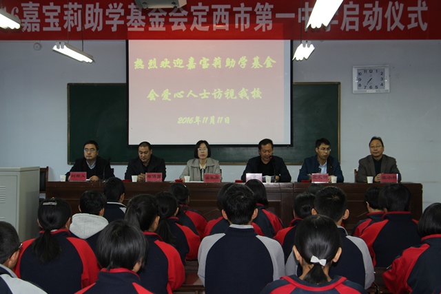 2016年11月11日下午,“廣東省嘉寶莉助學基金會定西一中2016年助學啟動儀式”在我校知行樓學生閱覽室舉行,校長盛淑蘭、嘉寶莉集團甘肅營銷中心經理侯志林、嘉寶莉集團甘肅定西市總代理韋保國、定西市教育局學生資助中心副主任王永明出席,啟動儀式由副校長劉順義主持。