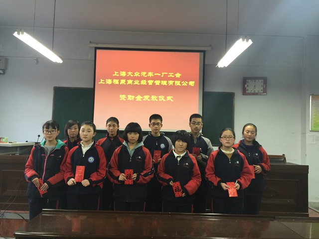 11月18日下午5點,我校在學生閱覽室舉行上海大眾汽車一廠工會、上海福聚商業(yè)經(jīng)營管理有限公司資助金發(fā)放儀式,副校長劉順義、政教處主任張小兵參加此次發(fā)放儀式。