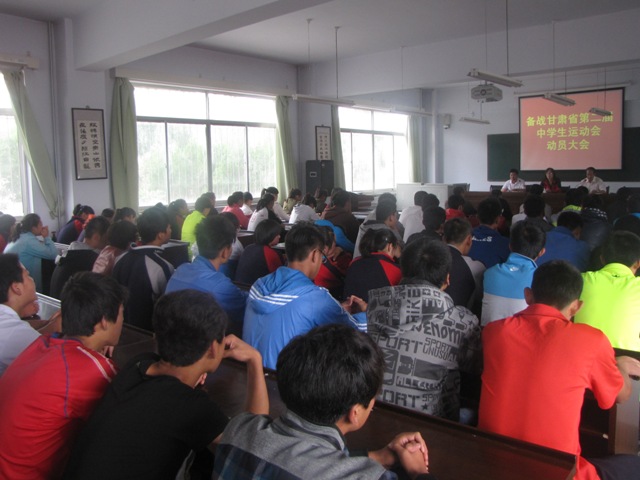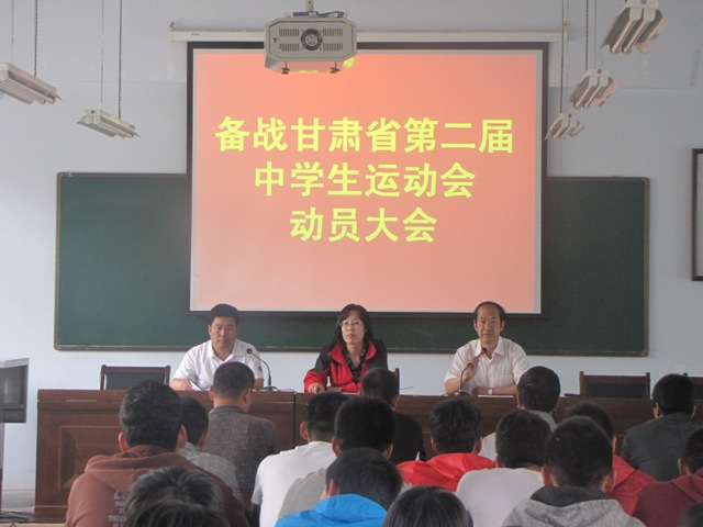甘肅省第二屆中學生運動會8月上旬在白銀市舉行,我校男排、女排、男籃等七支代表隊參加本次比賽。2013年7月10日下午,我校備戰甘肅省第二屆中學生運動會動員大會在學生閱覽室召開。校長盛淑蘭、副校長魏嵋、教務主任王國仁及全體教練和運動員參加了本次會議,會議由魏校長主持。????? ?