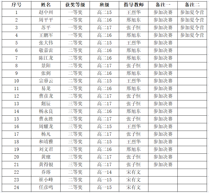 在2007年全國高中學生化學競賽甘肅賽區(qū)預賽中,我校有24名學生獲獎。高二(15)班趙中州等4人獲一等獎,高二(15)班張大偉、高一(14)班喬瑢等11人獲二等獎,高二(17)班剡辰等9人獲三等獎。以上獲獎同學中有21人獲得省級決賽資格。趙中州等4人將于7月22日至28日參加甘肅省化學奧林匹克夏令營暨第21屆全國高中學生化學競賽(省級決賽)講習班。