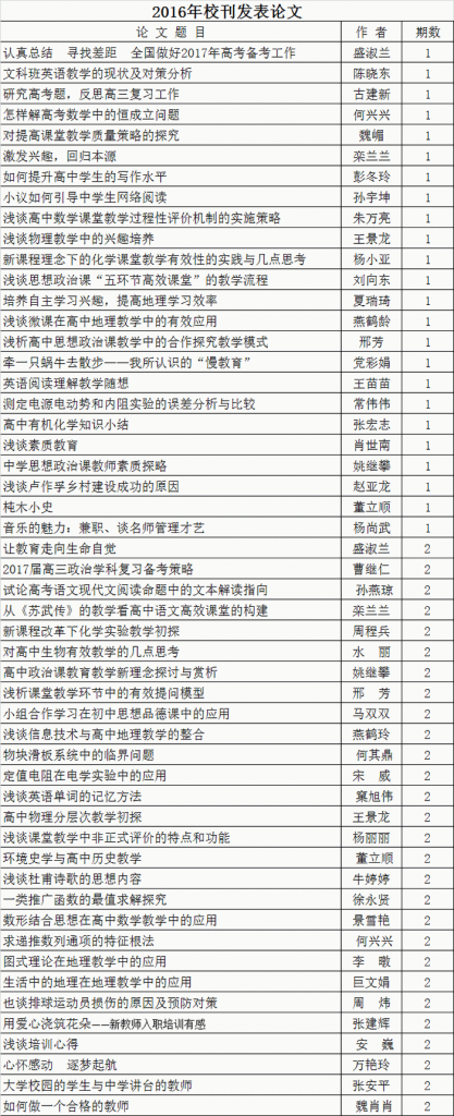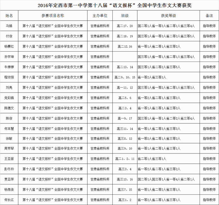 定西市第一中學2016年教研成果 時間:2017-03-17 分類:專業(yè)成長 [作者:李長虹 來源:教研處] 分享: 上一個: 我校召開2016年“一幫一結(jié)對子”會議 下一個: 結(jié)對幫扶促成長 凝心聚力求發(fā)展 相關(guān)文章 定西一中“對話名校 筑夢未來”系列活動|哈爾濱工業(yè)大學專場 【區(qū)域聯(lián)動 眾行致遠】智慧共享 ?智研共贏 【研經(jīng)悟理 授業(yè)傳道】廣學集智逐光行,求變則通耘夢田 定西一中“對話名校 筑夢未來”系列活動|山東大學專場 【“三抓三促”行動進行時】師徒同心展匠心 青藍攜手綻芳華 【“三抓三促”行動進行時】幫扶搭臺連校際 互鑒同行共育人 【“三抓三促”行動進行時】區(qū)域聯(lián)動促深度交流?攜手并進謀共同發(fā)展 【“三抓三促”行動進行時】細耕常規(guī) 智研共進