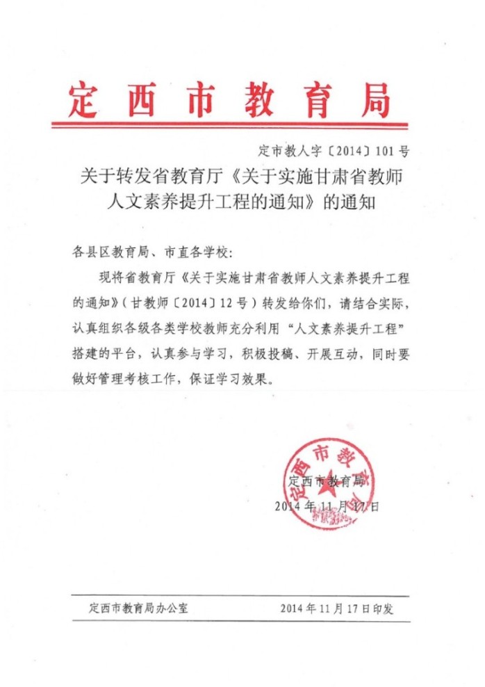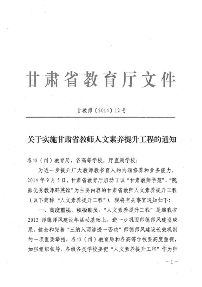 關于轉發省教育廳《關于實施甘肅省教師人文素養提升工程的通知》的通知 時間:2014-12-01 分類:專業成長 分享: 上一個: 我校舉行2014年優質課比賽 下一個: 2014年定西市第一中學教師發表論文統計 相關文章 定西一中“對話名校 筑夢未來”系列活動|哈爾濱工業大學專場 【區域聯動 眾行致遠】智慧共享 ?智研共贏 【研經悟理 授業傳道】廣學集智逐光行,求變則通耘夢田 定西一中“對話名校 筑夢未來”系列活動|山東大學專場 【“三抓三促”行動進行時】師徒同心展匠心 青藍攜手綻芳華 【“三抓三促”行動進行時】幫扶搭臺連校際 互鑒同行共育人 【“三抓三促”行動進行時】區域聯動促深度交流?攜手并進謀共同發展 【“三抓三促”行動進行時】細耕常規 智研共進