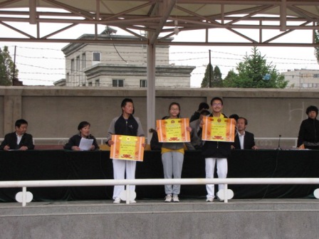 ?????? 經過激烈的角逐和評委們的認真評選,高一(5)班、高一(18)班獲一等獎,高一(6)班、(3)班(17)班獲二等獎,(10)班、(15)班、(16)班、(9)班、(14)班獲三等獎,學校領導為獲獎班級頒發了獎狀