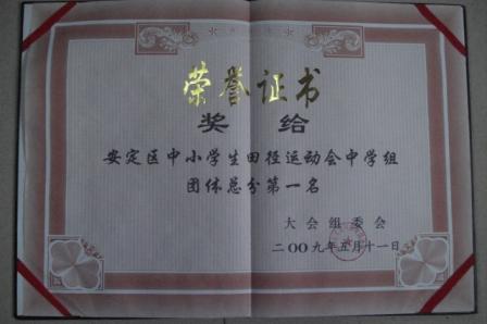 2009年5月8日——11日,在安定區體育場舉行的2009年安定區中小學田徑運動會上,我校田徑隊以150分的總成績榮獲完全中學組團體總分第一名,這是我校田徑隊連續四年獲得該項賽事冠軍。據了解,此次運動會完全中學組共有九個學校的代表隊參賽,第二、三名分別被東方紅中學和內官中學獲得。