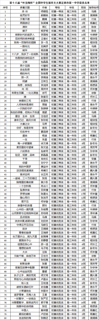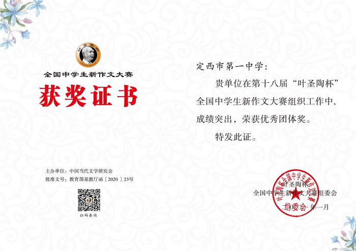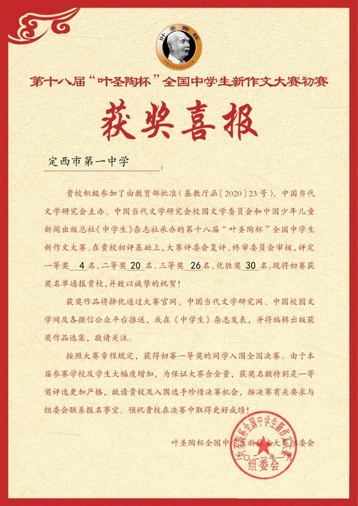 第十八屆“葉圣陶杯” 全國中學生新作文大賽初賽獲獎喜報 時間:2021-01-16 分類:校園新聞 分享: 上一個: 教育部:做到七個“要”,牢牢守住教育系統疫情防線 下一個: “上海大學優質生源基地”授牌儀式在我校隆重舉行 相關文章 賡續紅色血脈,勇擔育人使命——校黨委組織黨員教師開展學習貫徹黨的二十屆四中全會精神主題黨日活動 聚智兼善育品格 學思踐悟促成長—— 我校教師代表赴兼善中學參加交流活動 定西一中“對話名校 筑夢未來”系列活動|哈爾濱工業大學專場 【區域聯動 眾行致遠】智慧共享 ?智研共贏 定西一中“對話名校 筑夢未來”系列活動|山東大學專場 【“三抓三促”行動進行時】幫扶搭臺連校際 互鑒同行共育人 解碼科技革命浪潮 啟迪創新育人之路—— 福耀科技大學校長王樹國走進定西一中開講 中國科學院大學蒞臨定西市第一中學開展招生宣講工作