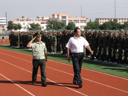 2010年8月16日至23日,我校高一1000多名新生在學校操場參加了為期一周的軍訓。23日上午,學校舉行了隆重的會操儀式,全體參訓同學進行了會操表演。校長董勇、副校長楊繼柏、趙榮,黨支部副書記宋淑華和工會主席董萬福以及承訓部隊領導人觀看會操表演,并為參訓各班評比打分。?????