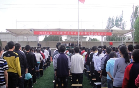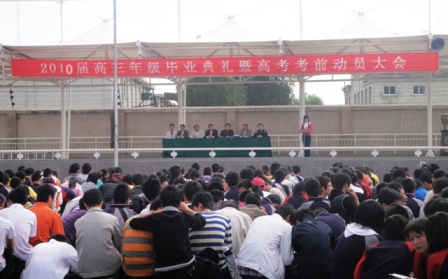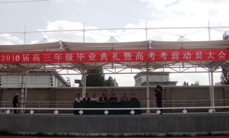 ?6月3日,在雄壯的國歌聲中,我校2010屆高三畢業(yè)典禮暨高考動(dòng)員大會(huì)在在大操場(chǎng)召開。校長(zhǎng)董勇,黨支部書記張東銳、副書記宋淑華,副校長(zhǎng)楊繼柏、魏嵋、趙榮,以及高三年級(jí)主任、各班班主任出席了畢業(yè)典禮,大會(huì)由張書記主持。 ??