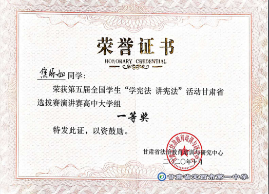本次演講賽分小學初中、高中大學兩個組,均在甘肅政法大學明法講堂舉行。我校高一(17)班焦爍如同學代表定西市參加高中大學組選拔賽,該組選手共59人。在20日的比賽抽簽中,焦爍如同學抽到了第2場,并于22日上午的初賽中取得了92.28分的好成績,以第2場第2名進入決賽。經過激烈角逐、穩定發揮,焦爍如同學在22日下午的決賽中榮獲演講比賽高中大學組“一等獎”。