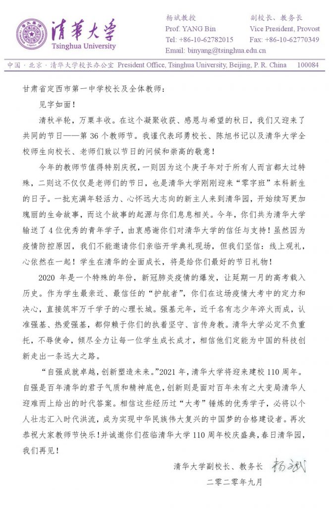 一封來自清華大學的感謝信 時間:2020-09-10 分類:校園新聞 分享: 上一個: 市委書記唐曉明 市委副書記、市長戴超一行慰問我校教師 下一個: 賀信 相關文章 賡續紅色血脈,勇擔育人使命——校黨委組織黨員教師開展學習貫徹黨的二十屆四中全會精神主題黨日活動 聚智兼善育品格 學思踐悟促成長—— 我校教師代表赴兼善中學參加交流活動 定西一中“對話名校 筑夢未來”系列活動|哈爾濱工業大學專場 【區域聯動 眾行致遠】智慧共享 ?智研共贏 定西一中“對話名校 筑夢未來”系列活動|山東大學專場 【“三抓三促”行動進行時】幫扶搭臺連校際 互鑒同行共育人 解碼科技革命浪潮 啟迪創新育人之路—— 福耀科技大學校長王樹國走進定西一中開講 中國科學院大學蒞臨定西市第一中學開展招生宣講工作