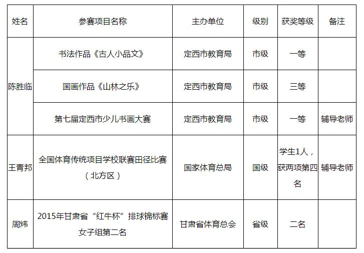 2015年定西市第一中學文體比賽獲獎統計 時間:2016-04-27 分類:教研成果 【來源:教研處】 分享: 上一個: 2015年定西一中參加學科競賽獲獎統計 下一個: 我校在2016年全國中學生生物聯賽決賽(甘肅賽區)中獲得優異成績 相關文章 喜報——我校學子在2025年第42屆全國中學生物理競賽甘肅聯賽中榮獲佳績 【“三抓三促”行動進行時】喜報——我校學子在2025年全國中學生數學奧林匹克競賽甘肅賽區聯賽中榮獲佳績 【“三抓三促”行動進行時】喜報——我校教師在2025年全市中小學基礎教育精品課遴選活動中榮獲佳績 【“三抓三促”行動進行時】喜報——我校學子在2024—2025學年全國版圖知識競賽(中小學組)活動中榮獲佳績 【“三抓三促”行動進行時】喜報——我校學子在2025年全國中學生生物學競賽甘肅賽區聯賽中榮獲佳績 【“三抓三促”行動進行時】喜報-我校學子在第21屆“外研社杯”全國中學生外語素養大賽中榮獲佳績 【“三抓三促”行動進行時】喜報——我校學子在2024年第41屆全國中學生物理競賽甘肅賽區聯賽中榮獲佳績 【“三抓三促”行動進行時】喜報——熱烈祝賀我校學子蔣啟明在第38屆中國化學奧林匹克競賽決賽中榮獲銅牌