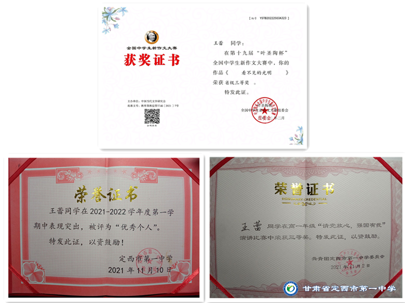 她勤學苦練,求思進取,有著端正的學習態度,刻苦鉆研課本知識。當學習過程中遇到難題時,也從不向其妥協,在課后及時虛心請教同學與師長。她樂觀面對學習中遇到的小挫折,“將壓力轉化為動力”是她的應對方法。在高一學期學習中,她嚴格要求自己,激勵自己,一直以來都在不斷進步,并在許多方面都取得顯著成績。多門學科年綜合評價為“優”,在2021-2022學年度第一學期獲得“優秀個人”“單科標兵”“進步標兵”等榮譽獎項。