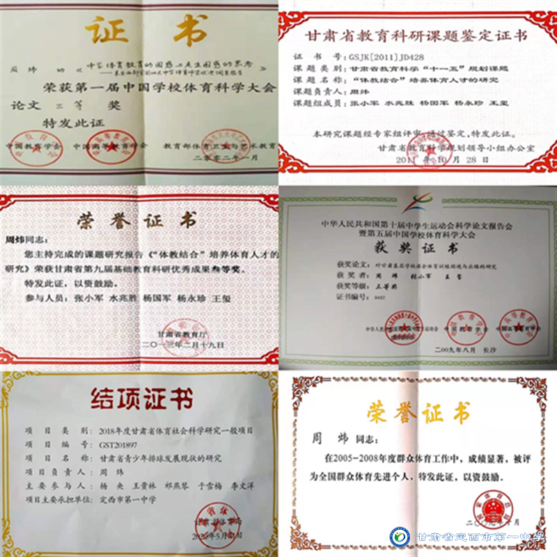 “理論來源于實踐,又反過來指導實踐。”周煒老師始終發(fā)揮著科學理論對實踐的指導作用,履行著“終身學習”的教師職業(yè)道德規(guī)范,在訓練中思考,又在思考中推動訓練。2002年1月撰寫論文《中學體育教育的困惑與走出困惑的思考》獲第一屆中國學校體育科學大會論文三等獎,2002年10月獲甘肅省第四屆基礎教育教學科研成果二等獎;2009年10月獲“全國群眾體育先進個人”榮譽稱號,同年被聘為甘肅省新課程實驗體育與健康學科專家指導組成員;2009年8月撰寫論文《甘肅基層學校課余體育訓練的困境與出路的思考》獲中華人民共和國第十屆中運會暨第五屆中國學校體育科學大會論文三等獎;2011年10月作為負責人完成甘肅省教育科學“十一五”規(guī)劃重點課題:《“體教結合”培養(yǎng)體育人才研究》,并通過省級鑒定;2009年11月被甘肅省教育廳聘為甘肅省新課程實驗《體育與健康》學科專家指導組成員;2010年1月在浙江寧波參加了國家級培訓,參與制定了甘肅省新課程實驗《體育與健康》學科實施指導綱要;2013年2月榮獲甘肅省第九屆基礎教育科研優(yōu)秀成果三等獎;2018年7月撰寫論文《定西一中女排訓練與發(fā)展的研究》獲甘肅省第十四屆運動會優(yōu)秀論文二等獎;2020年5月負責的甘肅省體育局社科項目《甘肅省青少年排球發(fā)展研究》結項;2020年12月被聘為“甘肅省排球協(xié)會副秘書長”。